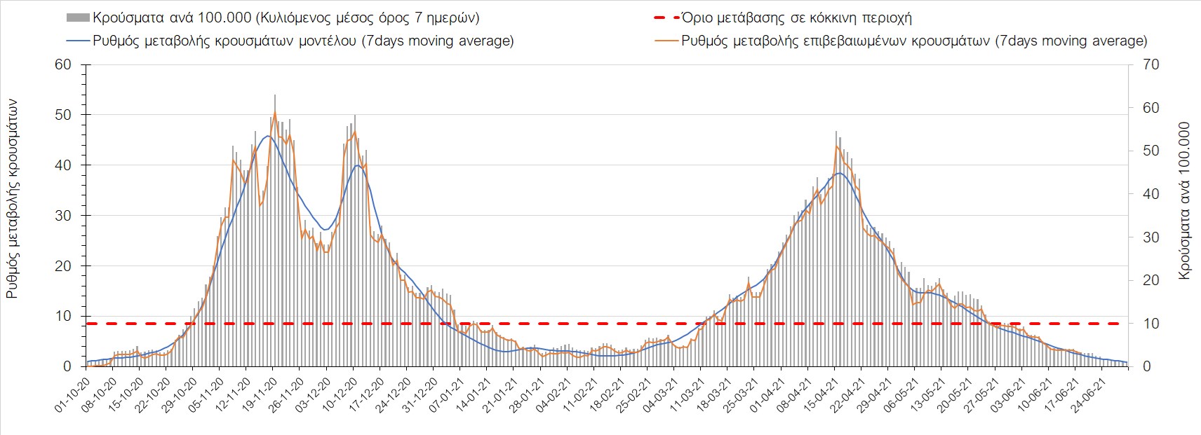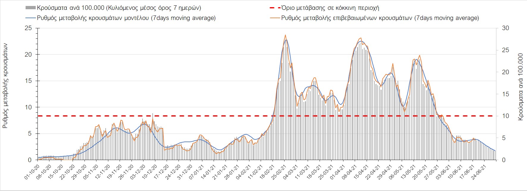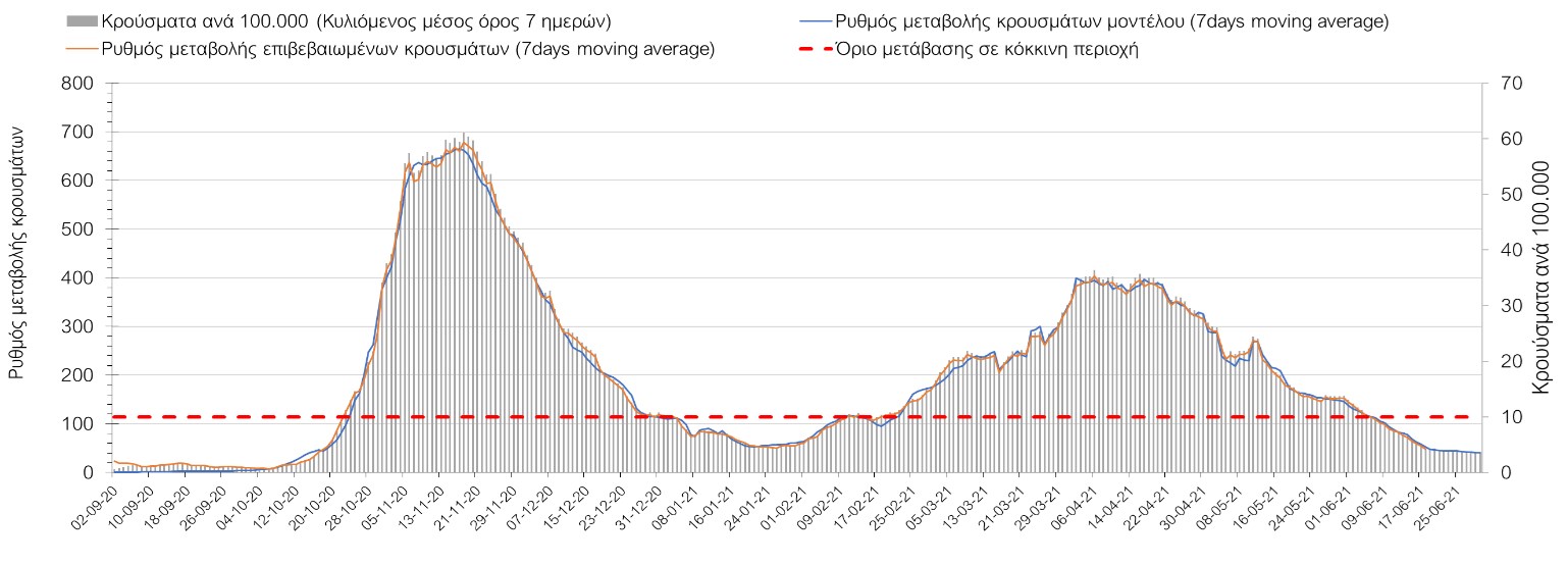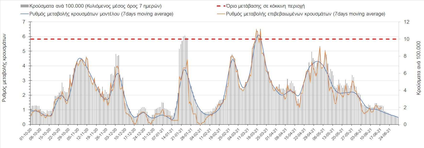 - σε μικρότερο βαθμό η πρόοδος των εμβολιασμών, η σημασία των οποίων στον έλεγχο της πανδημίας θα αρχίσει να είναι πιο εμφανής από το τέλος του Ιουνίου, λαμβάνοντας υπόψιν τη σημαντική αύξηση του ρυθμού εμβολιασμού από τα μέσα Απριλίου, με περίπου 110.000 εμβολιασμούς ημερησίως. Αξίζει να σημειωθεί ότι τις τελευταίες ημέρες παρατηρείται μια επιβράδυνση του ρυθμού εμβολιασμού. Τις επόμενες ημέρες, θα παρουσιάσουμε τις αναθεωρημένες προβλέψεις μας, λαμβάνοντας υπόψη την επιβράδυνση αυτή, οι επιπτώσεις της οποίας θα φανούν μετά τις αρχές Ιουλίου.