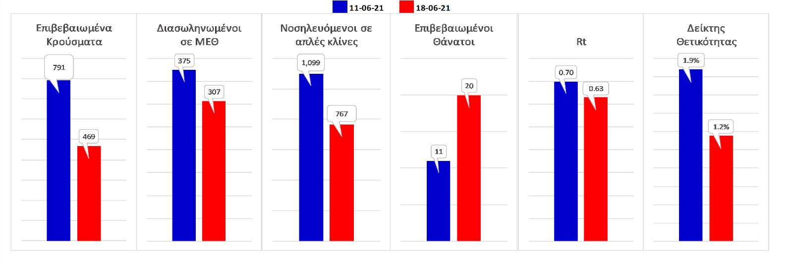 Σχήμα 53. Συγκριτικά αποτελέσματα της επιδημιολογικής εικόνας της σημερινής Παρασκευής (18/6/2021) σε σχέση με την προηγούμενη (11/6/2021) Όσον αφορά επιμέρους περιοχές, αν και όλες σχεδόν βρίσκονται σε πτωτική πορεία, ενώ με τα τωρινά δεδομένα και λαμβάνοντας υπόψη την αναμενόμενη πορεία, πλέον δεν υφίσταται ανάγκη επιτήρησης για καμία περιφέρεια, με πολύ μικρή επιφύλαξη μόνο για την Κοζάνη και την Πιερία.Με βάση τον υψηλό αριθμό των self-test που πραγματοποιείται τις τελευταίες εβδομάδες, πλέον δεν αναμένουμε αναστροφή της πορείας αποκλιμάκωσης, αρκεί να συνεχιστεί η συμμόρφωση με τα ισχύοντα μέτρα περιορισμού της πανδημίας (χρήση μάσκας και περιορισμοί που αφορούν κυρίως κλειστούς χώρους) και κυρίως η συνέχιση των self-test σε όσο το δυνατόν μεγαλύτερο τμήμα του πληθυσμού (με έμφαση στους εργαζόμενους σε δραστηριότητες με μεγάλο αριθμό ενεργών επαφών). Επίσης, σύμφωνα με τα πιο πρόσφατα στοιχεία που έγιναν διαθέσιμα, ανησυχία πλέον δημιουργεί η αύξηση του ποσοστού διασποράς του μεταλλαγμένου στελέχους Β.1.1.318 σε συγκεκριμένες περιοχές για το 15νθήμερο από 10/05/2021 έως 23/05/2021, όπου οι αντίστοιχες ποσοστώσεις είναι 17.57% για την Αττική, 52.11% για τη Στερεά Ελλάδα, 40% για την Ήπειρο και 19.28% για την Πελοπόννησο. Από τα αρχικά δεδομένα που έχουμε, διαφαίνεται να είναι πιο μεταδοτικό από το μεταλλαγμένο στέλεχος Β.1.1.7 που επικρατεί στο σύνολο της χώρας κατά περίπου 30% (και θα επανέλθουμε με πιο ακριβή στοιχεία για τη συγκεκριμένη εκτίμηση, όταν περισσότερα δεδομένα θα είναι διαθέσιμα), και με δεδομένη την απελευθέρωση των διαπεριφερειακών μετακινήσεων, χρειάζεται να δοθεί έμφαση στον άμεσο περιορισμό της διασποράς του, ενώ περαιτέρω εξάπλωση του θα οδηγήσει σε αναθεωρημένες προβλέψεις της επιδημιολογικής πορείας. Η αναχαίτιση του 3ου κύματος που παρατηρείται οφείλεται σε ένα συνδυασμό παραμέτρων, οι οποίες είναι