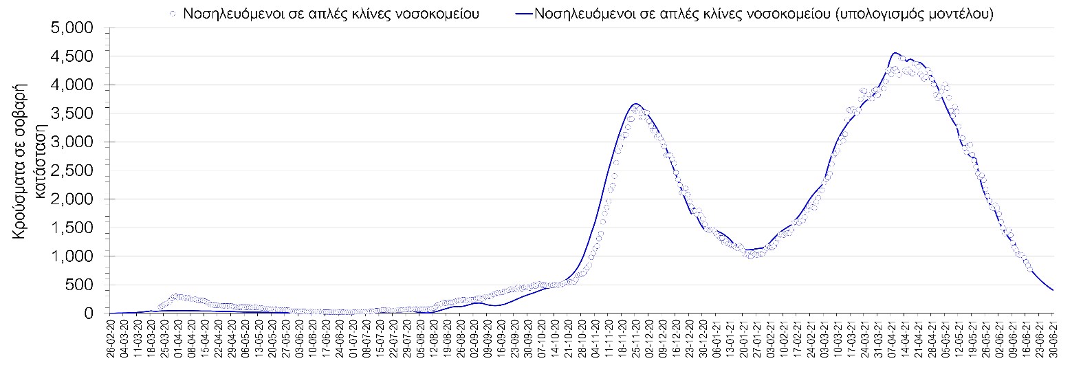 Σχήμα 2. Αριθμός κρουσμάτων σε σοβαρή κατάσταση (νοσηλευόμενοι σε απλές κλίνες) σύμφωνα με τα στοιχεία του ΕΟΔΥ και τις προβλέψεις της υπολογιστικής πλατφόρμας CORE.