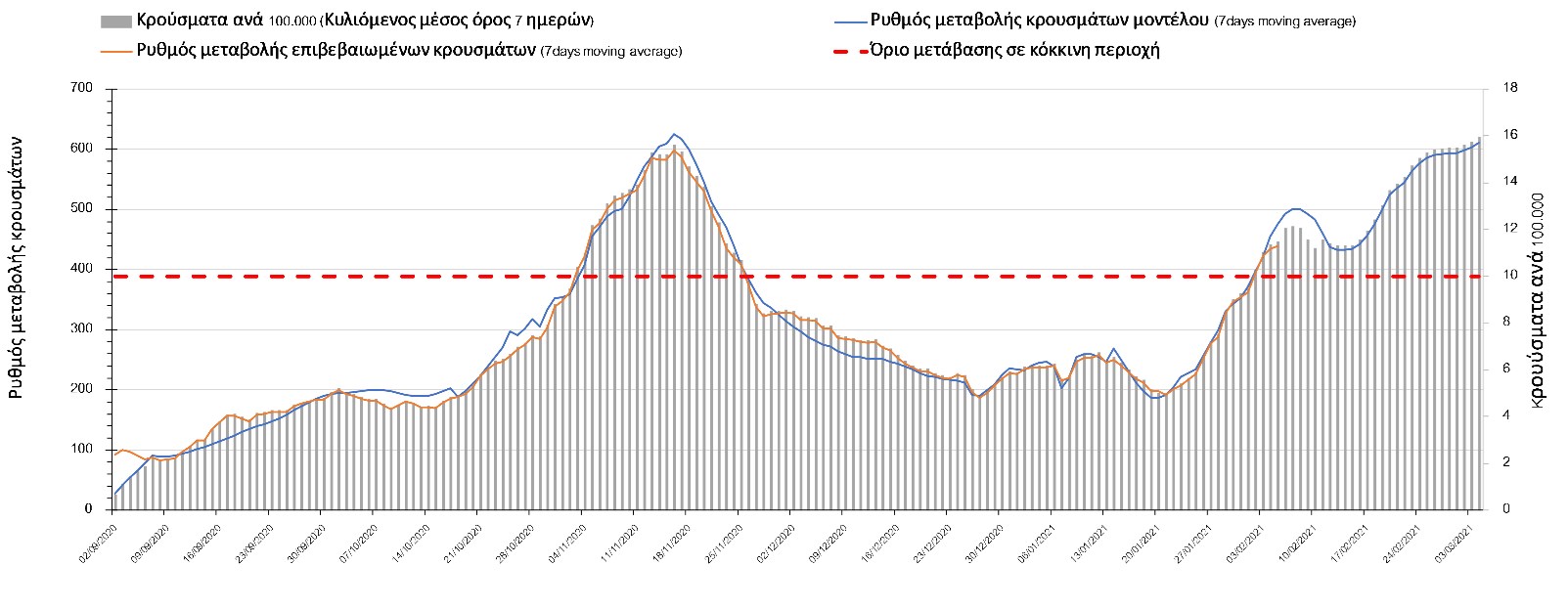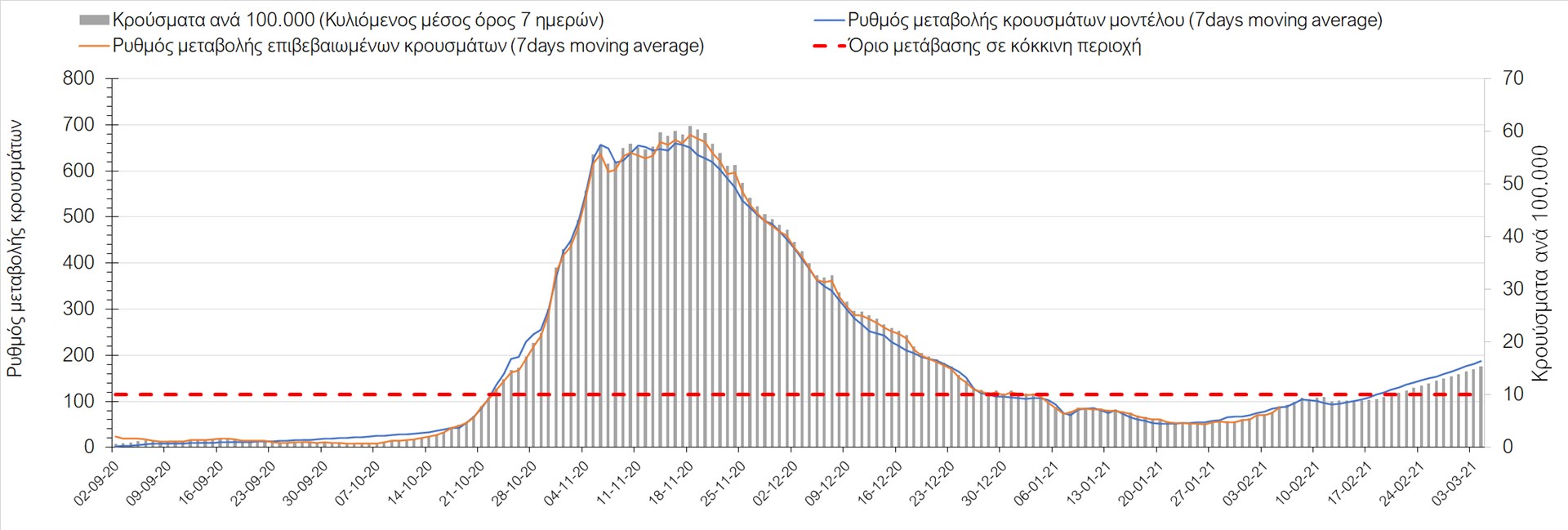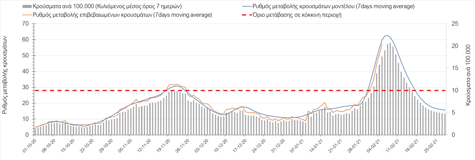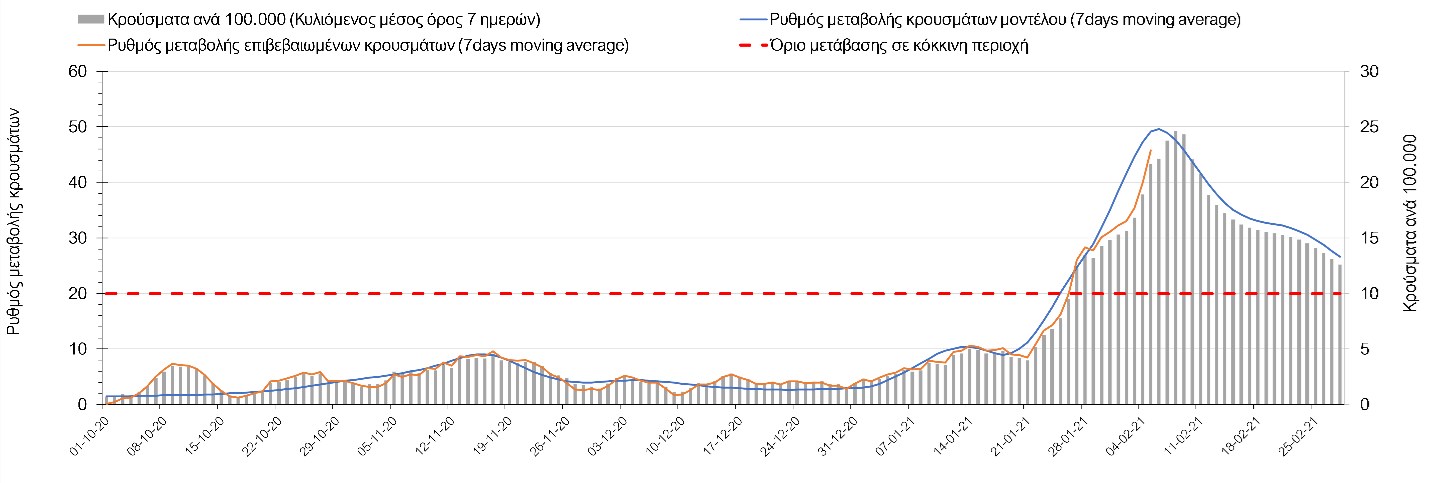Πορεία του ημερησίου αριθμού των κρουσμάτων (κυλιόμενος μέσος όρος 7 ημερών) στην Ελληνική επικράτεια