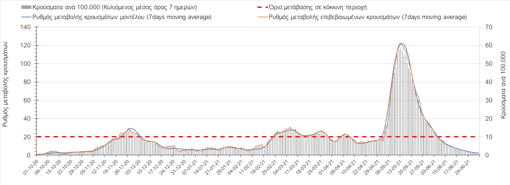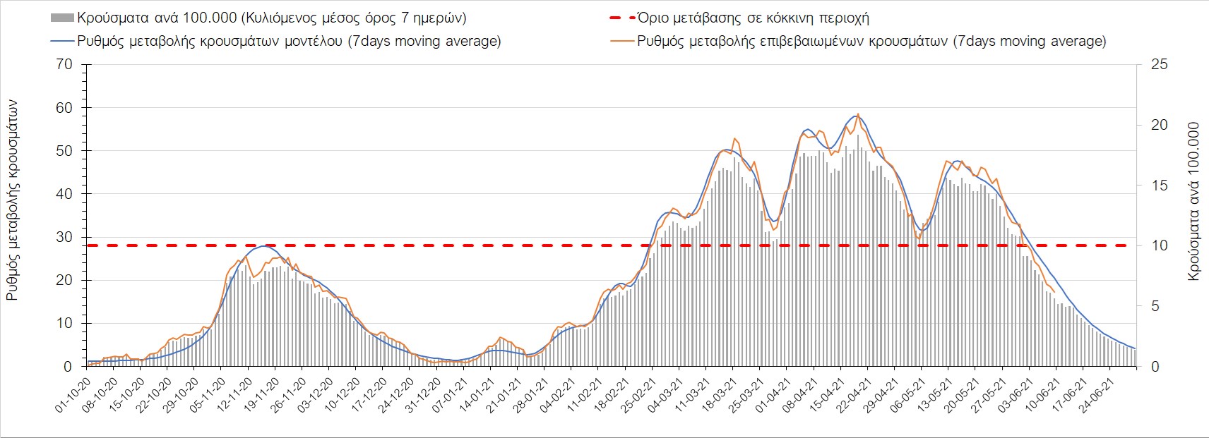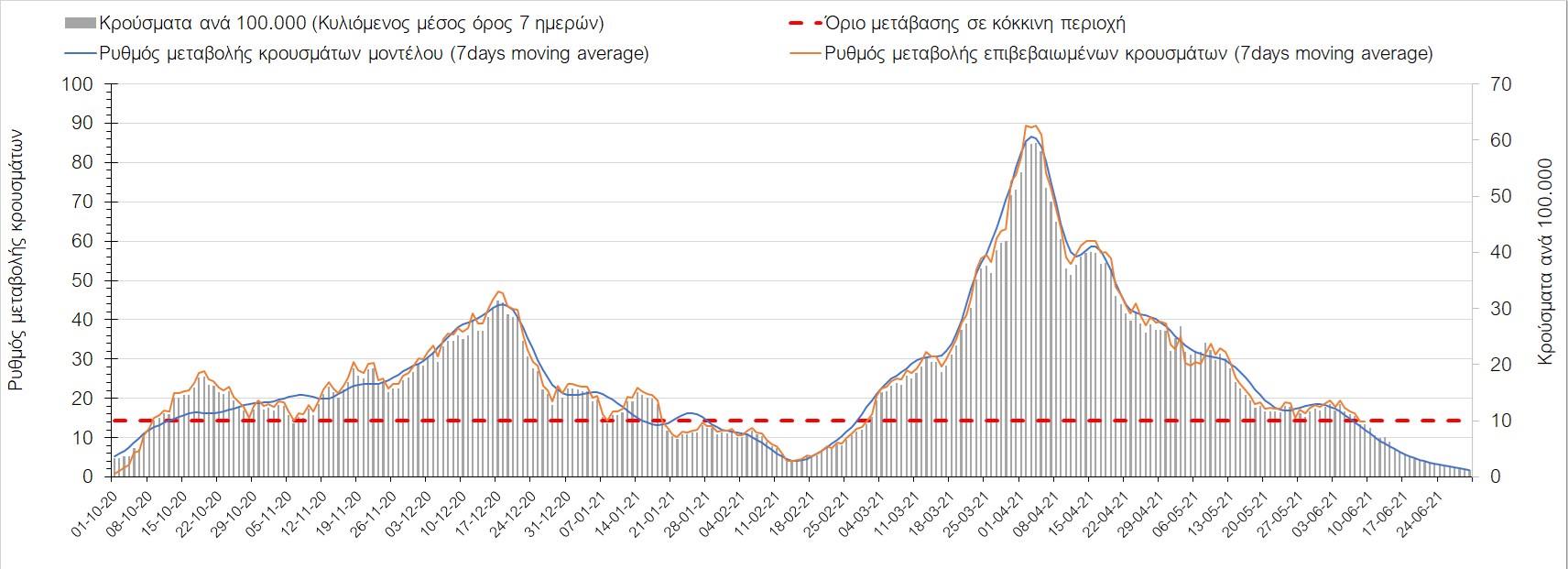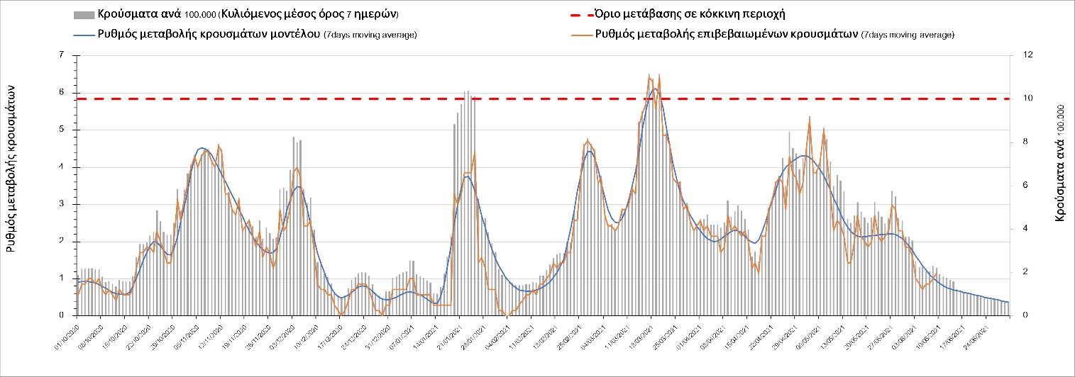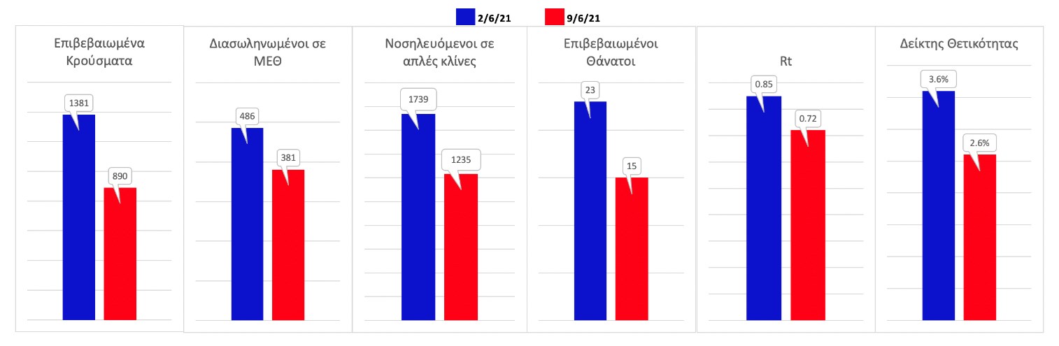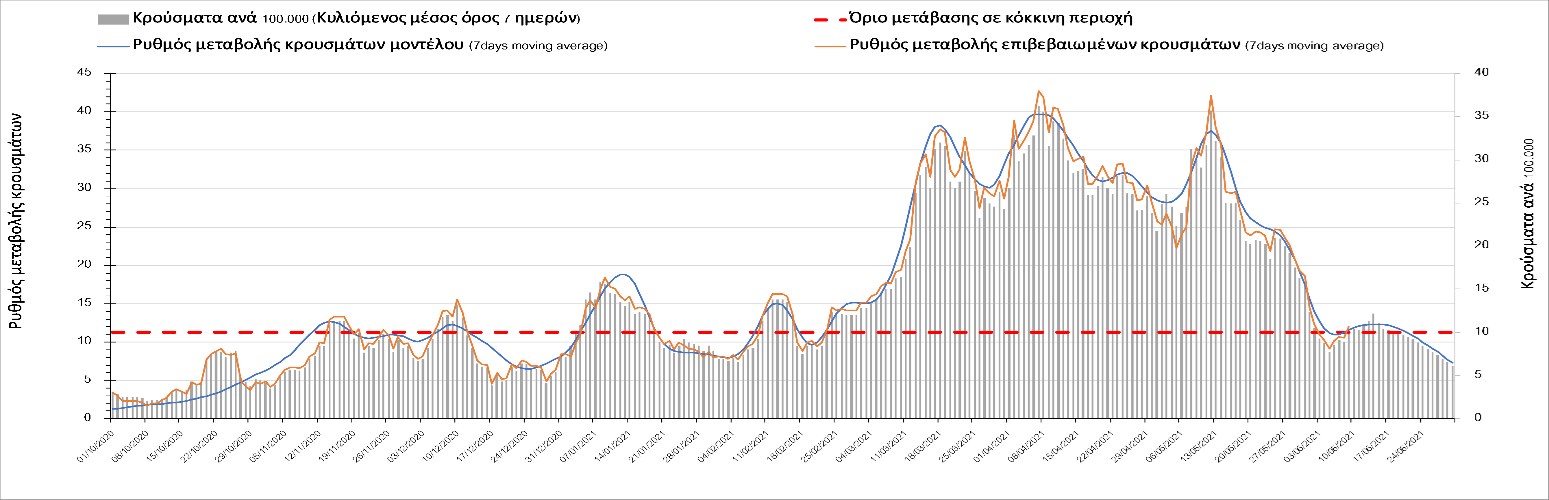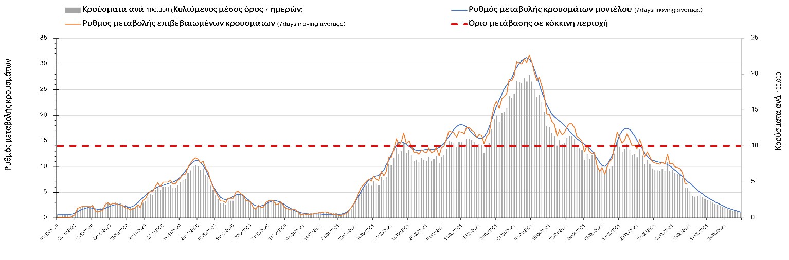 Σε πανελλαδικό επίπεδο ο κυλιόμενος εβδομαδιαίος μέσος όρος του δείκτη θετικότητας διαμορφώθηκε στο 2,6% (η ημερήσια τιμή είναι 2,1%) ενώ ο κυλιόμενος εβδομαδιαίος μέσος όρος του πραγματικού αριθμού αναπαραγωγής Rt (δηλαδή ο αριθμός των ατόμων που ένας φορέας μπορεί να επιμολύνει) διαμορφώθηκε στο 0,72 (τιμές του Rt κάτω από τη μονάδα υποδηλώνουν καθαρή μείωση της διασποράς του ιού στην κοινότητα). Συνολικά η πορεία της πανδημίας είναι πολύ καλή και διαφαίνεται από το γεγονός ότι σήμερα για πρώτη φορά μετά από 4 μήνες ο ημερήσιος αριθμός των κρουσμάτων (κυλιόμενος μέσος όρος 7 ημερών) είναι κάτω από 1000 (στα 986), και είναι ιδιαίτερα θετικό το γεγονός ότι επετεύχθη 5-6 μέρες νωρίτερα από την πρόβλεψη του μοντέλου CORE προ 20 ημερών. Η μικρή αυτή απόκλιση οφείλεται στον σημαντικά υψηλότερο αριθμό τω self-test που πραγματοποιήθηκαν τελικά.