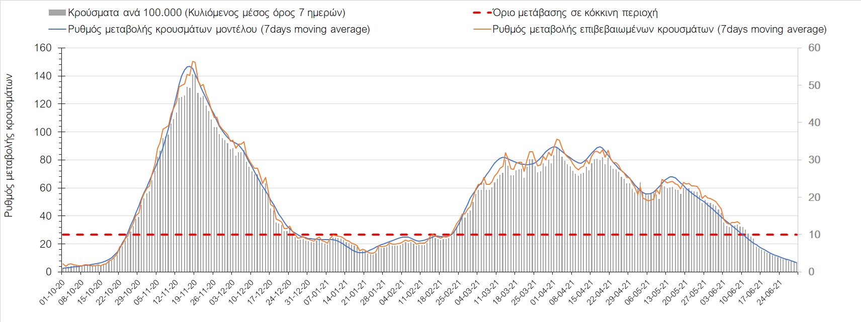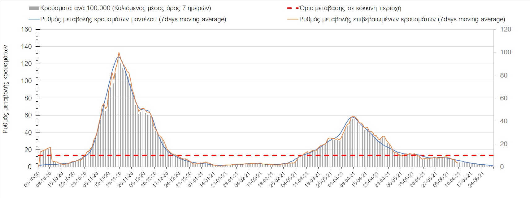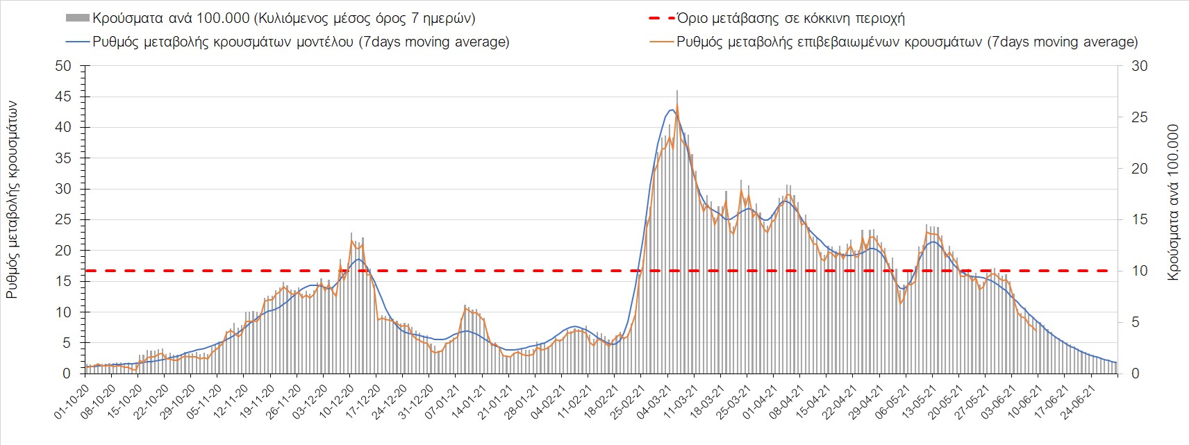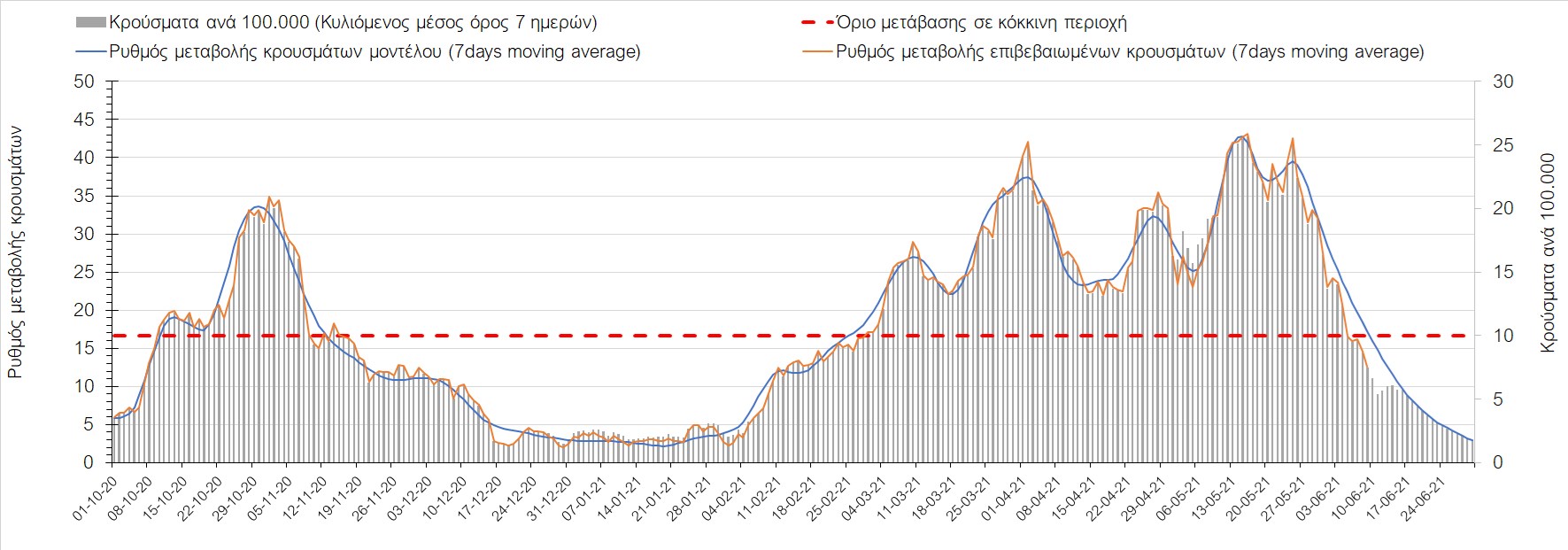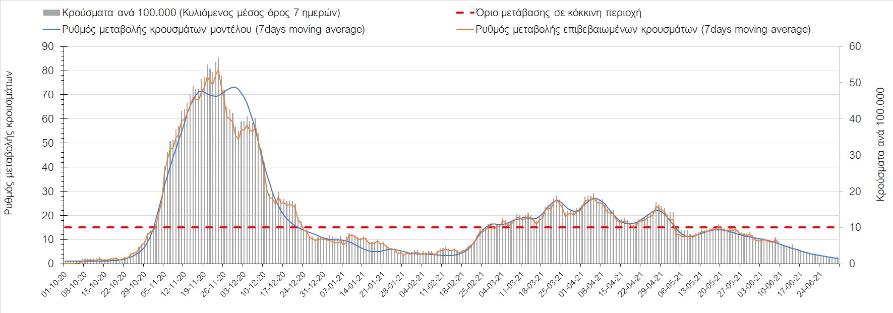 Σε πανελλαδικό επίπεδο ο κυλιόμενος εβδομαδιαίος μέσος όρος του δείκτη θετικότητας διαμορφώθηκε στο 2,6% (η ημερήσια τιμή είναι 2,1%) ενώ ο κυλιόμενος εβδομαδιαίος μέσος όρος του πραγματικού αριθμού αναπαραγωγής Rt (δηλαδή ο αριθμός των ατόμων που ένας φορέας μπορεί να επιμολύνει) διαμορφώθηκε στο 0,72 (τιμές του Rt κάτω από τη μονάδα υποδηλώνουν καθαρή μείωση της διασποράς του ιού στην κοινότητα). Συνολικά η πορεία της πανδημίας είναι πολύ καλή και διαφαίνεται από το γεγονός ότι σήμερα για πρώτη φορά μετά από 4 μήνες ο ημερήσιος αριθμός των κρουσμάτων (κυλιόμενος μέσος όρος 7 ημερών) είναι κάτω από 1000 (στα 986), και είναι ιδιαίτερα θετικό το γεγονός ότι επετεύχθη 5-6 μέρες νωρίτερα από την πρόβλεψη του μοντέλου CORE προ 20 ημερών. Η μικρή αυτή απόκλιση οφείλεται στον σημαντικά υψηλότερο αριθμό τω self-test που πραγματοποιήθηκαν τελικά.