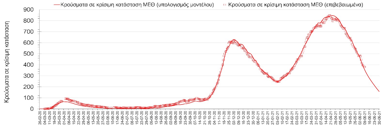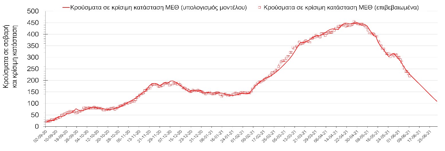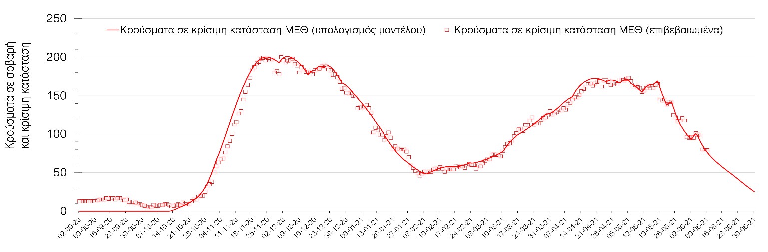 Σύμφωνα με τα στοιχεία του ΕΟΔΥ, ο αριθμός κρουσμάτων της Τετάρτης ανέρχεται στα 890 νέα κρούσματα, με τα αποτελέσματα να συνάδουν με τις προβλέψεις της υπολογιστικής πλατφόρμας CORE (n=890). Ο αριθμός των τεστ που πραγματοποιήθηκαν ήταν 41982 και σε συνδυασμό με τον αριθμό των κρουσμάτων, ο δείκτης θετικότητας διαμορφώθηκε στο 2,1%. Η πραγματοποίηση αριθμού τεστ σε επίπεδα άνω των 50.000 την ημέρα, συντελεί στο να εξάγουμε πιο ασφαλή συμπεράσματα σχετικά με την πορεία της πανδημίας, αλλά και να εντοπίζονται περισσότεροι ασυμπτωματικοί και προσυμπτωματικοί, συντελώντας στον περιορισμό της πανδημίας. Γενικά όμως θα πρέπει να αυξηθεί κι άλλο ο αριθμός των τεστ ανίχνευσης του SARS-CoV-2 χρησιμοποιώντας τα rapid test και τα self test για να καταπολεμηθεί η δυναμική αύξησης της διασποράς στις περιοχές όπου μια τέτοια αύξηση διαφαίνεται από τα μέχρι τώρα δεδομένα και την υπολογιστική πλατφόρμα CORE, αλλά και για να συνεχιστεί η πολύ καλή πορεία στο σύνολο της χώρας.Ο αριθμός ημερήσιων θανάτων (15) που καταγράφηκε είναι σημαντικά μειωμένος σε σχέση με προχθές (30). Όπως είχαμε προβλέψει από την προηγούμενη εβδομάδα, ο κυλιόμενος εβδομαδιαίος μέσος όρος που την Τετάρτη είναι 29 έχει ξεκινήσει αποκλιμάκωση σε συνδυασμό με την πτωτική πορεία του αριθμού των κρουσμάτων.Όσον αφορά στους ασθενείς σε κρίσιμη κατάσταση (διασωληνωμένοι σε ΜΕΘ), ο αριθμός τους παρέμεινε σταθερός σε σχέση με προχθές (381 από 381). Παρά τις παρατηρούμενες διακυμάνσεις, συνεχίζεται η αποκλιμάκωση με βάση την επικαιροποιημένη πρόβλεψη (αυτό βέβαια με την παραδοχή ότι θα συνεχίσουν να τηρούνται τα ισχύοντα μέτρα, συμπεριλαμβανομένων των προβλεπόμενων selftest και ανοίγματα δραστηριοτήτων υψηλού συγχρωτισμού, όπως τα mall και η εστίαση θα γίνουν με την κατάλληλη προετοιμασία). Αξίζει να σημειωθεί ότι ο αριθμός των ασθενών σε κρίσιμη κατάσταση όπως και των θανάτων είναι αναλογικά χαμηλότερος σε σχέση με τα αντίστοιχα μεγέθη στο δεύτερο κύμα, τόσο λόγω των εμβολιασμών ευπαθών ομάδων, όσο και του υψηλότερου αριθμού τεστ ανίχνευσης, που συντελεί στον εντοπισμό περισσότερων ασυμπτωματικών ή ήπια συμπτωματικών κρουσμάτων. Επίσης, η διασπορά των μεταλλαγμένων στελεχών που έχουν μεγαλύτερη μεταδοτικότητα από το στέλεχος του SARS-CoV-2 που κυριαρχούσε μέχρι το τέλος Φεβρουαρίου και η αυξημένη κινητικότητα του πληθυσμού έχουν μεγαλώσει το ποσοστό των νεότερων ηλικιών που μολύνονται με αποτέλεσμα η μέση ηλικία των μολύνσεων να έχει πέσει σημαντικά. Η καμπύλη εξέλιξης του αριθμού των ασθενών που νοσηλεύονται σε κλίνες ΜΕΘ με βάση τις προσομοιώσεις της πλατφόρμας CORE, όπως αυτή παρουσιάζεται στο Σχήμα 1, των ασθενών που νοσηλεύονται σε απλές κλίνες στο Σχήμα 2, ενώ μια εκτίμηση για την πορεία των θανάτων ανά ημέρα παρουσιάζεται στο Σχήμα 3. Η πτωτική πορεία σε όλους τους δείκτες θα συνεχιστεί αλλά σε ό,τι αφορά στον αριθμό εισαγωγών στα νοσοκομεία και στους θανάτους η ταχύτητα αποκλιμάκωσης θα είναι μειωμένη σε σχέση με την προηγούμενη περίοδο.