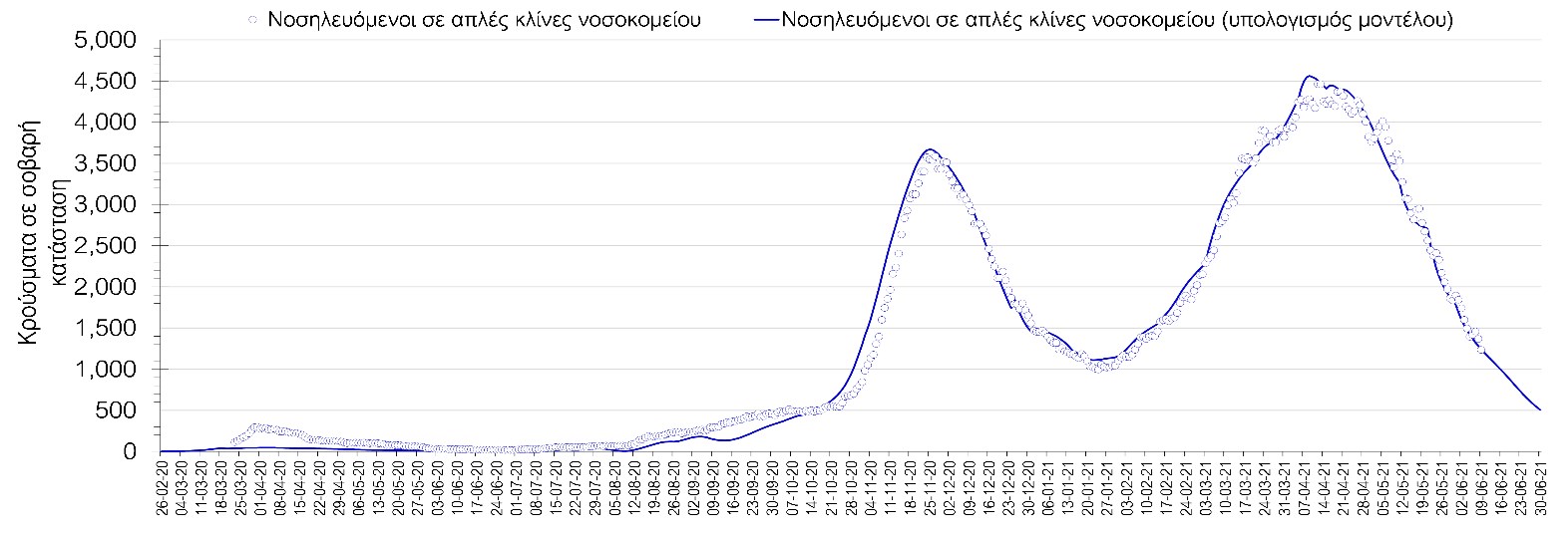 Σχήμα 2. Αριθμός κρουσμάτων σε σοβαρή κατάσταση (νοσηλευόμενοι σε απλές κλίνες) σύμφωνα με τα στοιχεία του ΕΟΔΥ και τις προβλέψεις της υπολογιστικής πλατφόρμας CORE.