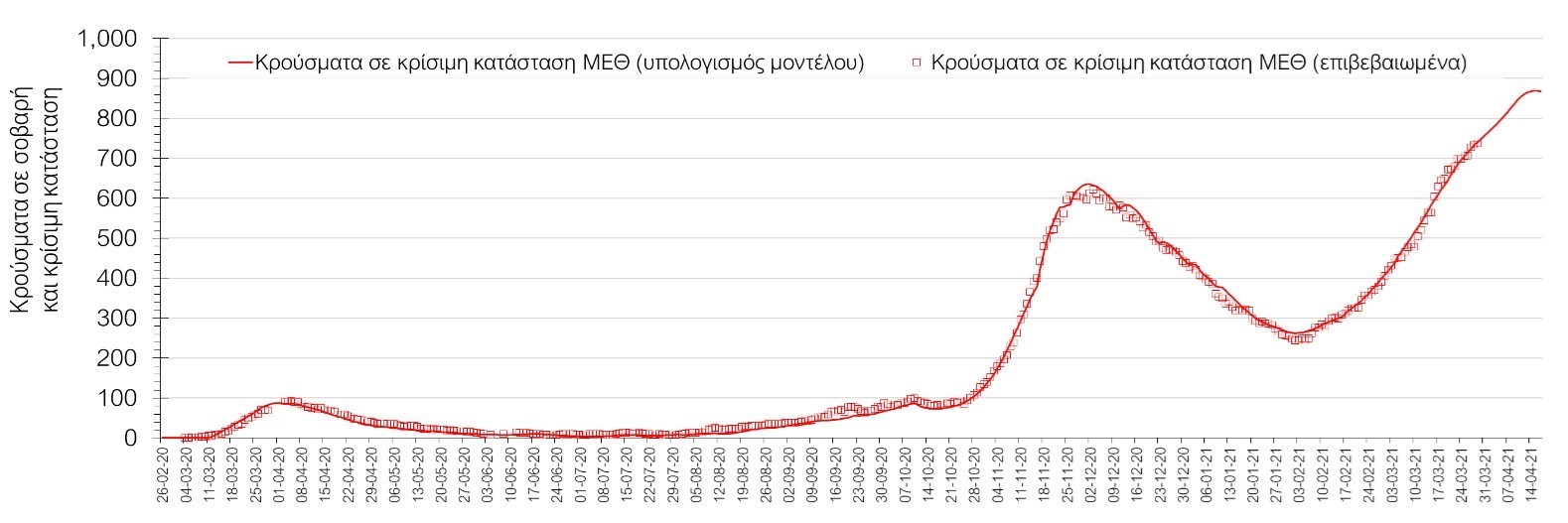 Σχήμα 1. Αριθμός κρουσμάτων σε κρίσιμη κατάσταση (ΜΕΘ) σύμφωνα με τα στοιχεία του ΕΟΔΥ και τις προβλέψεις της υπολογιστικής πλατφόρμας CORE.