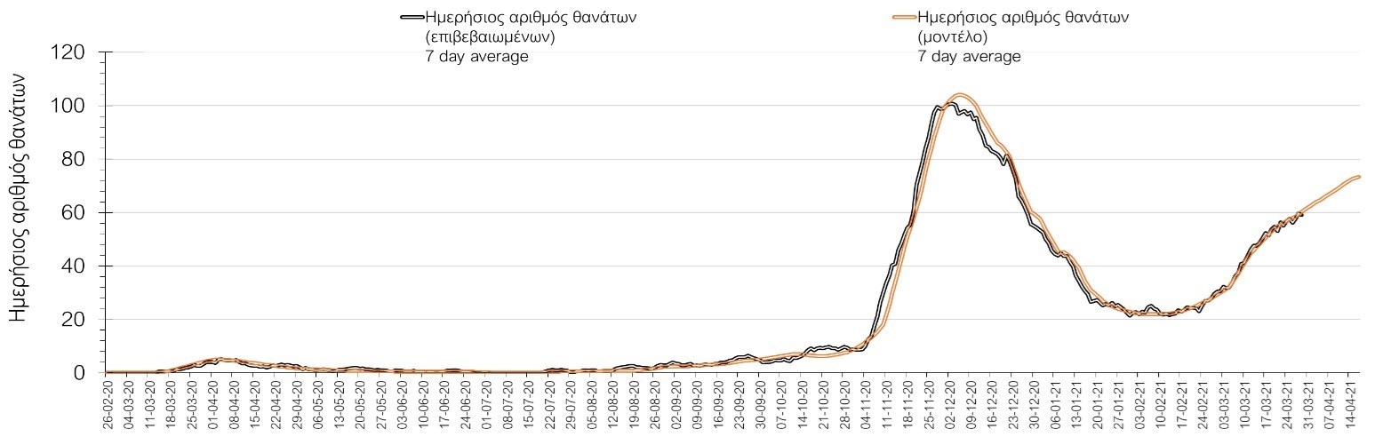 Σχήμα 2. Αριθμός θανάτων (κυλιόμενος μέσος όρος 7 ημερών) σύμφωνα με τα στοιχεία του ΕΟΔΥ και τις προβλέψεις της υπολογιστικής πλατφόρμας CORE.