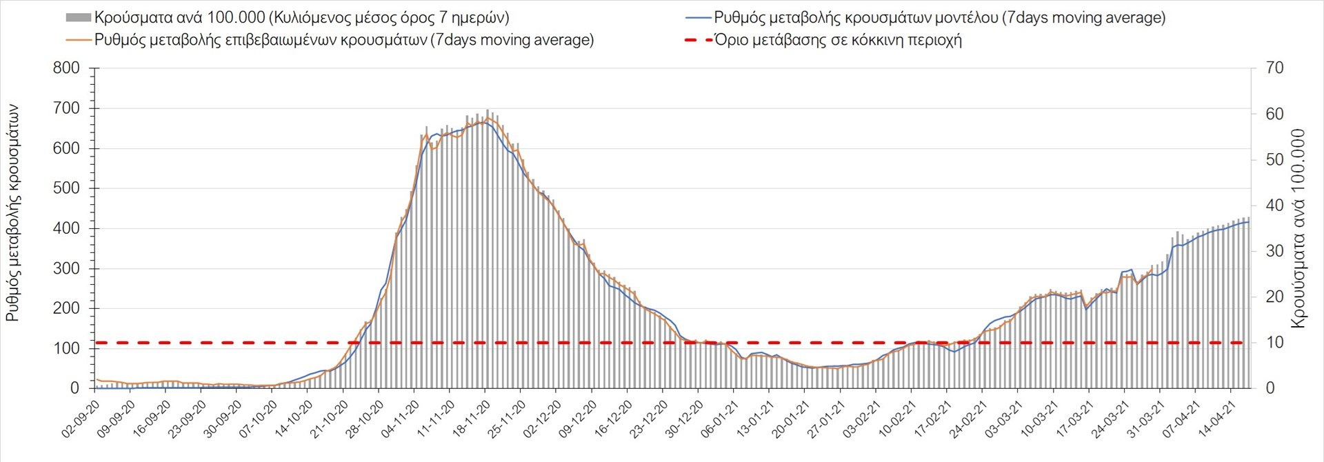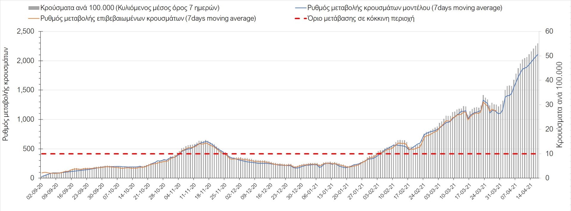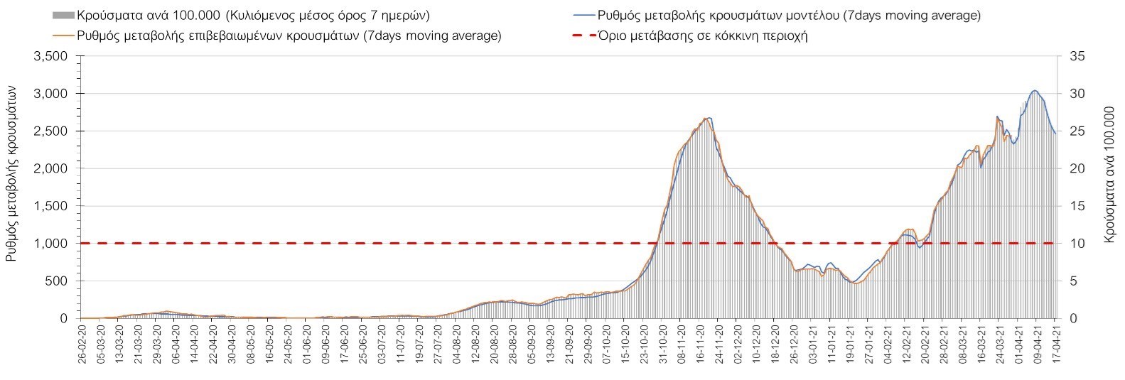 Σχήμα 3. Πορεία του ημερησίου αριθμού των κρουσμάτων (κυλιόμενος μέσος όρος 7 ημερών) στην Ελληνική επικράτεια