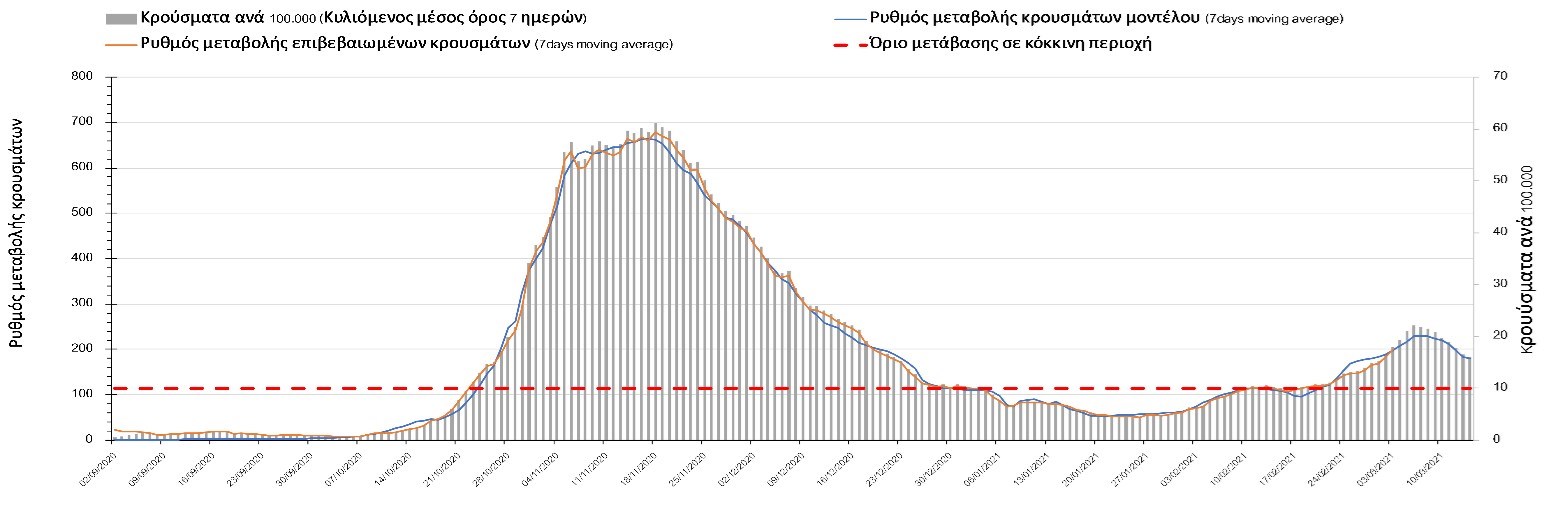 Πορεία του ημερησίου αριθμού των κρουσμάτων (κυλιόμενος μέσος όρος 7 ημερών) στην Ελληνική επικράτεια