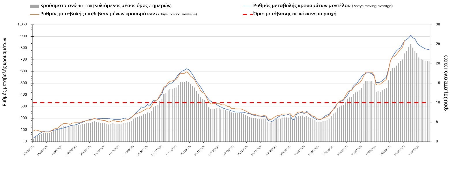 Σε πανελλαδικό επίπεδο ο κυλιόμενος εβδομαδιαίος μέσος όρος του δείκτη θετικότητας αυξήθηκε στο 4,4% (η ημερήσια τιμή την Τετάρτη ήταν 5,0%) ενώ ο κυλιόμενος εβδομαδιαίος μέσος όρος του πραγματικού αριθμού αναπαραγωγής Rt (δηλαδή ο αριθμός των ατόμων που ένας φορέας μπορεί να επιμολύνει) είναι πλέον 1,29 (τιμές του Rt πάνω από τη μονάδα υποδηλώνουν καθαρή αύξηση της διασποράς του ιού στην κοινότητα). Παρατηρείται δηλαδή εδώ και λίγες ημέρες, σύμφωνα με τους ειδικούς του ΑΠΘ, μια σταθεροποίηση της αύξησης της διασποράς του SARS-CoV-2 στη χώρα.