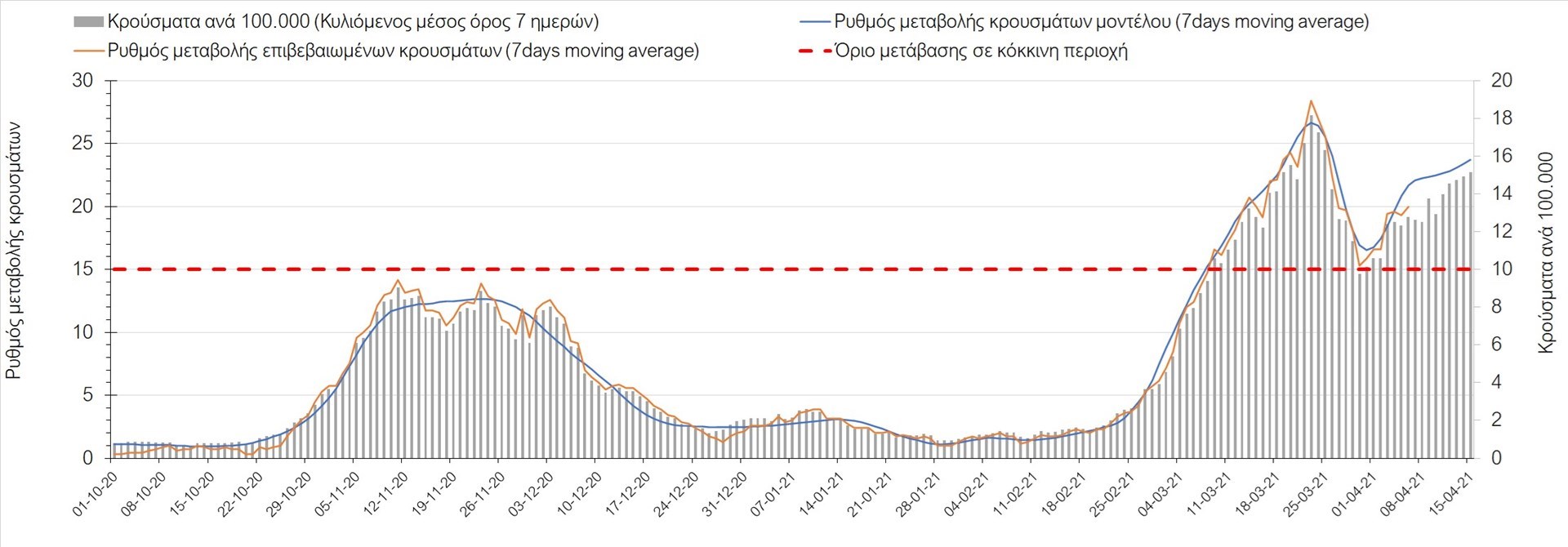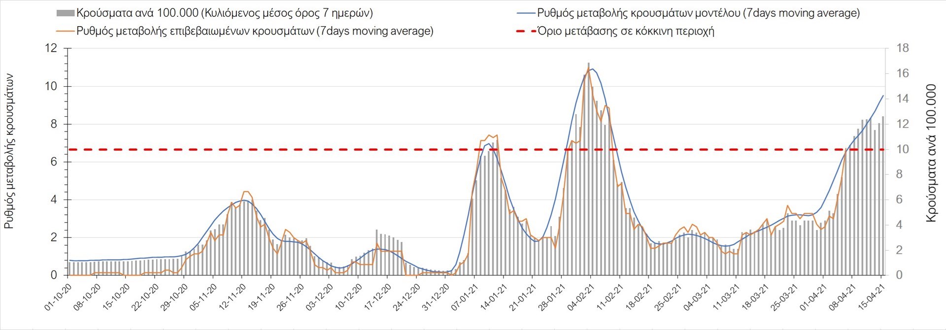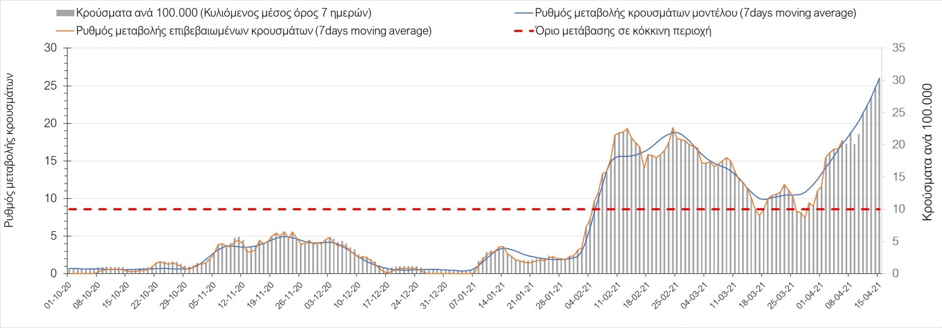 Πορεία του ημερησίου αριθμού των κρουσμάτων (κυλιόμενος μέσος όρος 7 ημερών) στο Ηράκλειο