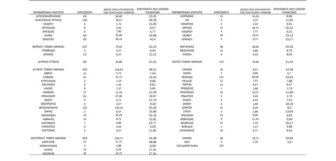 Υψηλά νούμερα καταγράφονται επίσης στο Ηράκλειο (61), στα Ιωάννινα (54), στην Κέρκυρα (51), στη Λάρισα (72) και στα Χανιά (48), ενώ υφίστανται 155 κρούσματα που τελούν υπό διερεύνηση.