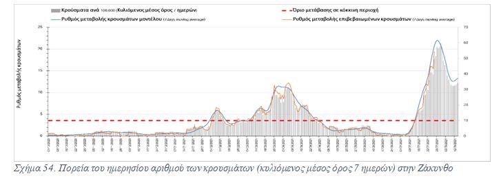 Σχήμα 54. Πορεία του ημερησίου αριθμού των κρουσμάτων (κυλιόμενος μέσος όρος 7 ημερών) στην Ζάκυνθο