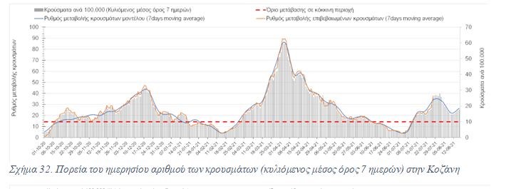 Σχήμα 32. Πορεία του ημερησίου αριθμού των κρουσμάτων (κυλιόμενος μέσος όρος 7 ημερών) στην Κοζάνη