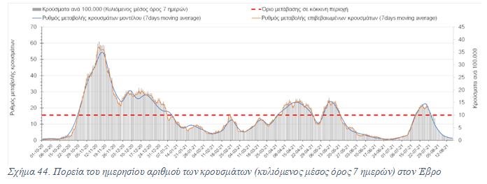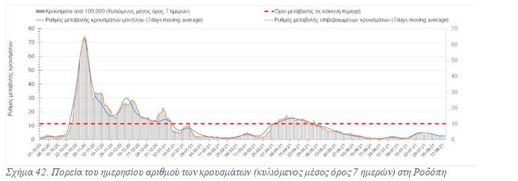 Σχήμα 42. Πορεία του ημερησίου αριθμού των κρουσμάτων (κυλιόμενος μέσος όρος 7 ημερών) στη Ροδόπη