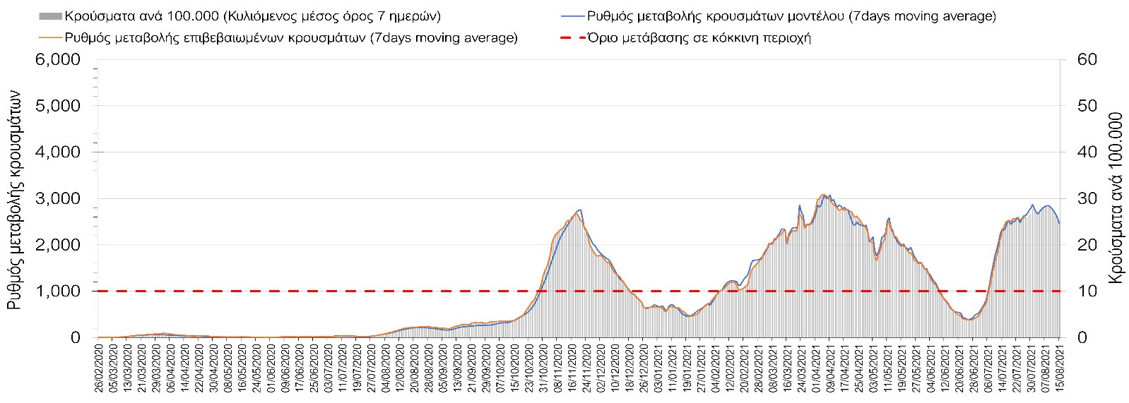 - Θεωρήσαμε ότι από τις αρχές Αυγούστου, θα έχουμε αύξηση των επαφών λόγω της μαζικής εξόδου των διακοπών, με τρόπο παραπλήσιο με αυτόν που παρατηρήθηκε το καλοκαίρι του 2020.