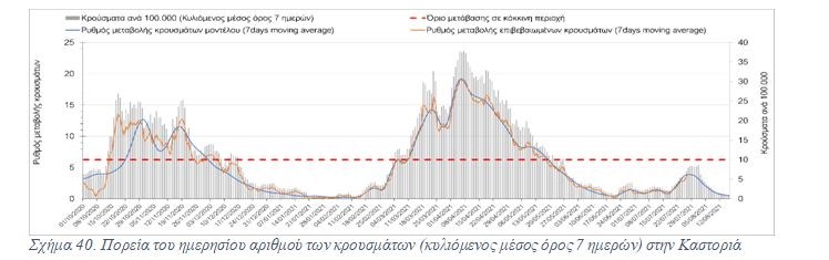 Σχήμα 40. Πορεία του ημερησίου αριθμού των κρουσμάτων (κυλιόμενος μέσος όρος 7 ημερών) στην Καστοριά