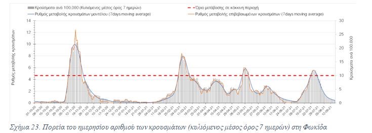 Σχήμα 23. Πορεία του ημερησίου αριθμού των κρουσμάτων (κυλιόμενος μέσος όρος 7 ημερών) στη Φωκίδα
