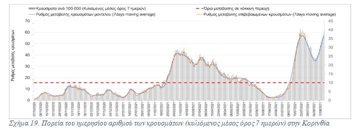 Σχήμα 19. Πορεία του ημερησίου αριθμού των κρουσμάτων (κυλιόμενος μέσος όρος 7 ημερών) στην ΚορινθίαΣτην Αιτωλοακαρνανία όπου εντοπίσθηκαν 21 κρούσματα, παρατηρείται αυξημένος αριθμός κρουσμάτων σε σχέση με τη Δευτέρα (14 κρούσματα) (Σχήμα 20), αλλά ακόμα δεν έχει διαμορφωθεί κάποια ισχυρή ανοδική τάση. Στην Εύβοια, με 51 κρούσματα , παρατηρείται μεγαλύτερος αριθμός κρουσμάτων σε σχέση με τη Δευτέρα (Σχήμα 21), με τη συνολική πορεία να είναι ανοδική και να έχει περάσει το όριο χαρακτηρισμού ως κόκκινη περιοχή. Μεγαλύτερο αριθμό κρουσμάτων είχαμε στη Βοιωτία όπου εντοπίστηκαν 32 κρούσματα (Σχήμα 22), όπου επίσης έχει ξεπεράσει το όριο χαρακτηρισμού ως κόκκινη περιοχή και διαμορφώνεται έντονη άνοδος. Μικρότερος σε σχέση με τη Δευτέρα ήταν ο αριθμός των κρουσμάτων στη Φθιώτιδα όπου εντοπίσθηκαν 17 κρούσματα (Σχήμα 24). Στην Ευρυτανία δεν εντοπίστηκαν κρούσματα (Σχήμα 25), ενώ στη Φωκίδα εντοπίστηκαν 6 κρούσματα (Σχήμα 23) και η ανοδική τάση, την έφερε πάνω από το όριο χαρακτηρισμού ως κόκκινη περιοχή.
