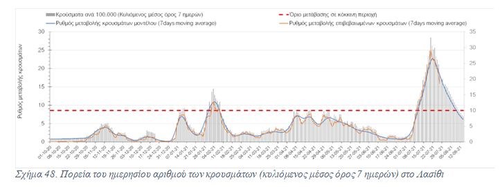 Σχήμα 48. Πορεία του ημερησίου αριθμού των κρουσμάτων (κυλιόμενος μέσος όρος 7 ημερών) στο ΛασίθιΣτη Λέσβο, εντοπίστηκαν 20 νέα κρούσματα (Σχήμα 49) οπότε η έντονη αύξηση που παρατηρήθηκε και την οδήγησε πάνω από το όριο της κόκκινής περιοχής, παρουσιάζει ανοδικές διακυμάνσεις. Στην Κέρκυρα, εντοπίστηκαν 25 κρούσματα (Σχήμα 50) και παρατηρείται μεγαλύτερος αριθμός κρουσμάτων σε σχέση με τη Δευτέρα, επανάκαμψη του ανοδικού κύματος και πλέον η περιοχή πέρασε αρκετά πάνω από το όριο χαρακτηρισμού ως κόκκινη. Στη Χίο όπου εντοπίστηκαν 51 κρούσματα , διαμορφώνεται και εδώ μια έντονα ανοδική τάση (Σχήμα 51). Στη Θάσο, εντοπίστηκε 1 κρούσμα (Σχήμα 52). Στην Πάρο παρουσιάζεται αυξημένος αριθμός κρουσμάτων σε σχέση με χτες καθώς εντοπίστηκαν 28 κρούσματα (Σχήμα 53) και η συνολική πορεία παρουσιάζει σημάδια αποκλιμάκωσης. Στην Μύκονο εντοπίστηκαν 24 κρούσματα (Σχήμα 55) και έχει περιέλθει σε αποκλιμάκωση, ενώ στη Σαντορίνη που δεν εντοπίστηκαν νέα κρούσματα (Σχήμα 56), παρουσιάζεται ξανά καθοδική τάση. Στην Ζάκυνθο εντοπίστηκαν 39 κρούσματα και συνεχίζεται η έντονα ανοδική πορεία (Σχήμα 54), όπως και στην Ρόδο όπου εντοπίστηκαν 78 κρούσματα (Σχήμα 57).