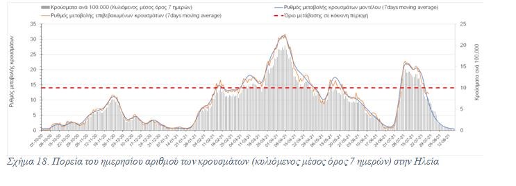 Σχήμα 18. Πορεία του ημερησίου αριθμού των κρουσμάτων (κυλιόμενος μέσος όρος 7 ημερών) στην Ηλεία
