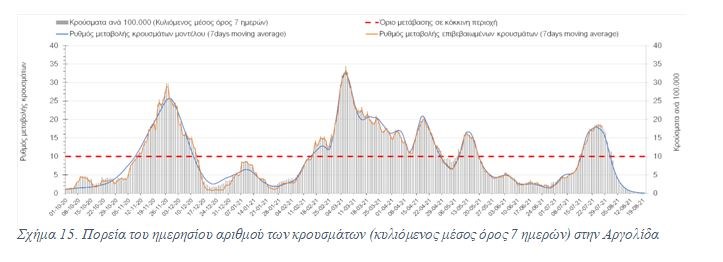 Σχήμα 15. Πορεία του ημερησίου αριθμού των κρουσμάτων (κυλιόμενος μέσος όρος 7 ημερών) στην Αργολίδα