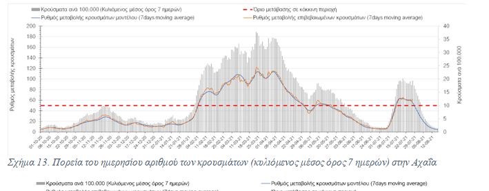 Σχήμα 13. Πορεία του ημερησίου αριθμού των κρουσμάτων (κυλιόμενος μέσος όρος 7 ημερών) στην Αχαΐα