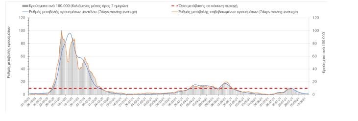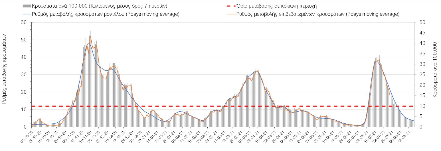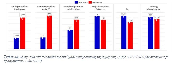 Σχήμα 58. Συγκριτικά αποτελέσματα της επιδημιολογικής εικόνας της σημερινής Τρίτης (27/07/2021) σε σχέση με την προηγούμενη (20/07/2021) Όσον αφορά επιμέρους περιοχές, αρκετές πλέον βρίσκονται πάνω από το όριο χαρακτηρισμού ως κόκκινες, όπως η Αθήνα, η Θεσσαλονίκη η Λάρισα, η Μαγνησία, τα Τρίκαλα, η Αχαΐα, η Αργολίδα, η Αρκαδία, η Κορινθία, η Μεσσηνία, η Εύβοια, η Βοιωτία, τη Φωκίδα, τα Ιωάννινα, η Θεσπρωτία, η Πρέβεζα, η Κοζάνη, η Φλώρινα, η Χαλκιδική, ο Έβρος, το Ηράκλειο, τα Χανιά, το Ρέθυμνο, το Λασίθι, η Κέρκυρα, η Λέσβος, η Πάρος, η Ζάκυνθος, η Μύκονος, η Σαντορίνη και η Ρόδος, ενώ παρατηρούνται έντονα ανοδικές τάσεις στην Άρτα, στην Καβάλα, στη Δράμα, στη Πιερία, στην Ημαθία, στη Ξάνθη και στη Χίο. Ιδιαίτερα ανησυχητική είναι η αυξητική πορεία σε τουριστικούς προορισμούς όπως η Πάρος, η Κέρκυρα, η Ζάκυνθος, η Ρόδος, η Χαλκιδική, η Χίος, η Λέσβος, αλλά και σε περιοχές πιο κοντά στην Αθήνα όπως η Βοιωτία, η Εύβοια, η Κορινθία και η Αργολίδα. Στην Πελοπόννησο ανησυχητικά αυξητική τάση παρουσιάζουν σχεδόν όλες οι περιφερειακές ενότητες με εξαίρεση την Ηλεία, ενώ στην ηπειρωτική και Βόρειο Ελλάδα, η Κοζάνη, η Φλώρινα, ο Έβρος. Στην Κρήτη παραμένει σε υψηλά επίπεδα διασποράς το Ηράκλειο, όπως επίσης και τα Χανιά. Σε αυτές τις περιοχές συνιστούμε κινητοποίηση κλιμακίων του ΕΟΔΥ για αυξημένους ελέγχους με rapid test και καλή ιχνηλάτηση επαφών των θετικών περιπτώσεων.Ιδιαίτερα στην Αθήνα (παρά την πτωτική πορεία), προβληματίζει ο βαθμός που αυτή σχετίζεται με την εξάπλωση μεταλλαγμένων και ταχύτερα μεταδιδόμενων στελεχών (κυρίως το Β.1.1.318 και το Β.1.167). Χαρακτηριστικό παράδειγμα της αυξημένης μεταδοτικότητας του στελέχους Δ (Β.1.167) αποτελεί η Κρήτη. Συνολικά η Κρήτη είναι η περιοχή με τη χειρότερη επιδημιολογική εικόνα και η ταχύτητα μετάδοσης (και το αντίστοιχο ύψος του 4ου κύματος που έχει διαμορφωθεί) είναι ενδεικτική της αυξημένης μεταδοτικότητας του στελέχους Δ. Επίσης, καταδεικνύει τον αρνητικό ρόλο που παίζουν οι διαπεριφερειακές μετακινήσεις στη φάση ανάπτυξης της πανδημίας, καθώς η αρχική αύξηση κρουσμάτων στο Ρέθυμνο πρώτα και στο Ηράκλειο έπειτα, ακολουθήθηκε από αυξητική πορεία της διασποράς στα Χανιά και στο Λασίθι. Στην πράξη, η Κρήτη είναι μια περιοχή οδικά απομονωμένη από την υπόλοιπη Ελλάδα, στην οποία, οι διαπεριφερειακές μετακινήσεις επέτρεψαν τη γρήγορη διασπορά του στελέχους Δ. Παρόμοια φαινόμενα διαπεριφερειακής μετάδοσης παρατηρούνται στη Θεσσαλία, αλλά σε πιο ήπια έκταση, όπου η έντονα αυξητική τάση στη Μαγνησία, μεταφέρθηκε σε κάποιο βαθμό και στη Λάρισα, ενώ ακολουθεί και η Καρδίτσα. Αντίστοιχη είναι η διάχυση της διασποράς στην Ήπειρο και πιο συγκεκριμένα από τα Ιωάννινα προς τα εγγύς τουριστικά θέρετρα (Πρέβεζα και Θεσπρωτία). Συνεπώς, ακόμα και για περιοχές που για την ώρα είναι κάτω από το όριο (ή πολύ κοντά στο όριο), οι ανοδικές τάσεις που παρατηρούνται χρήζουν αυξημένης επιδημιολογικής επιτήρησης με εντατικοποίηση του γονιδιωματικού ελέγχου ώστε να ληφθούν εγκαίρως μέτρα περιορισμού της διασποράς του ιού.Επίσης, σύμφωνα με τα πιο πρόσφατα στοιχεία που έγιναν διαθέσιμα, ανησυχία πλέον δημιουργεί η αύξηση του ποσοστού διασποράς του μεταλλαγμένου στελέχους Β.1.617.2 (μετάλλαξη Δέλτα) σε συγκεκριμένες περιοχές για το 15νθήμερο από 04/07/2021 έως 18/07/2021, όπου οι αντίστοιχες ποσοστώσεις είναι 25.13% για την Αττική, 6.67% για τη Δυτική Ελλάδα, 33.33% γι