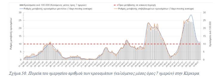 Σχήμα 50. Πορεία του ημερησίου αριθμού των κρουσμάτων (κυλιόμενος μέσος όρος 7 ημερών) στην Κέρκυρα