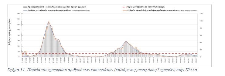 Σχήμα 31. Πορεία του ημερησίου αριθμού των κρουσμάτων (κυλιόμενος μέσος όρος 7 ημερών) στην Πέλλα