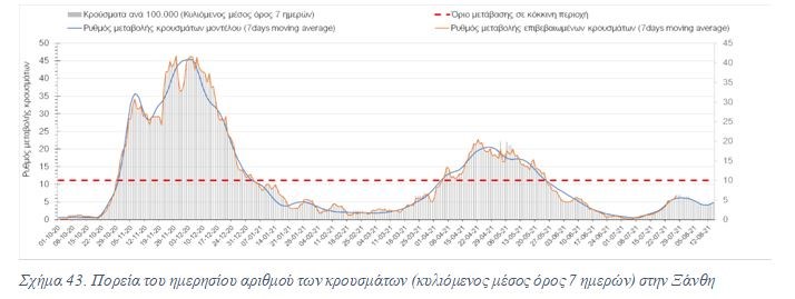 Σχήμα 43. Πορεία του ημερησίου αριθμού των κρουσμάτων (κυλιόμενος μέσος όρος 7 ημερών) στην Ξάνθη