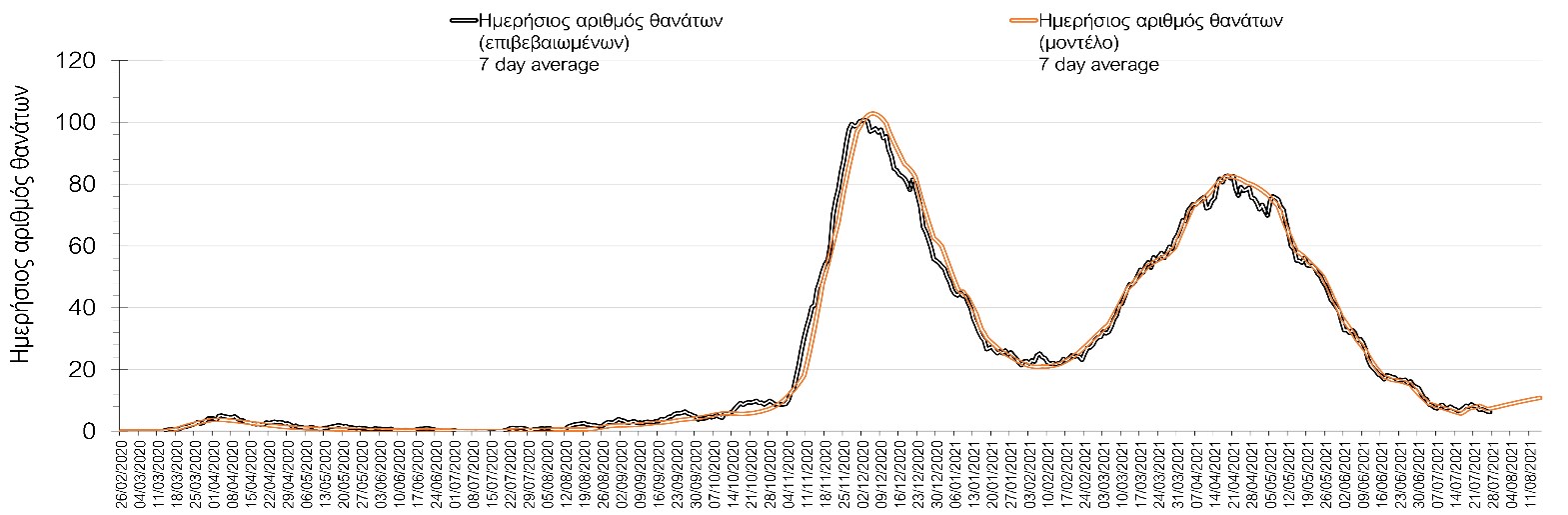 Σχήμα 3. Αριθμός θανάτων (κυλιόμενος μέσος όρος 7 ημερών) σύμφωνα με τα στοιχεία του ΕΟΔΥ και τις προβλέψεις της υπολογιστικής πλατφόρμας CORE.Η πορεία της μέσης εβδομαδιαίας τιμής των κρουσμάτων, καθώς και του κυλιόμενου μέσου όρου 7 ημερών του αριθμού των κρουσμάτων ανά 100.000 πληθυσμού, όπως έχουν καταγραφεί από τον ΕΟΔΥ και η αναμενόμενη πορεία τους όπως προδιαγράφεται από την υπολογιστική πλατφόρμα CORE για την Ελληνική επικράτεια μέχρι τις 15 Αυγούστου, αποτυπώνονται στο Σχήμα 4. Αυτή η προβλεπόμενη πορεία, που αφορά τα κρούσματα, τους νοσηλευόμενους σε απλές κλίνες, όσο και σε ΜΕΘ, καθώς επίσης και τους θανάτους, βασίζεται στις ακόλουθες παραδοχές: