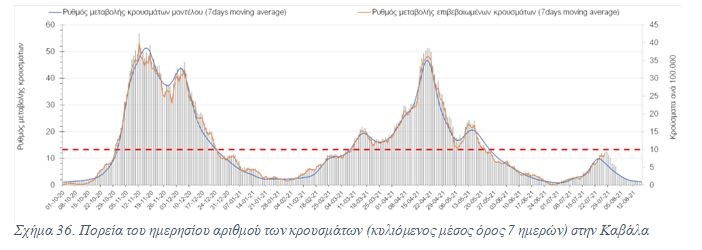 Σχήμα 36. Πορεία του ημερησίου αριθμού των κρουσμάτων (κυλιόμενος μέσος όρος 7 ημερών) στην Καβάλα
