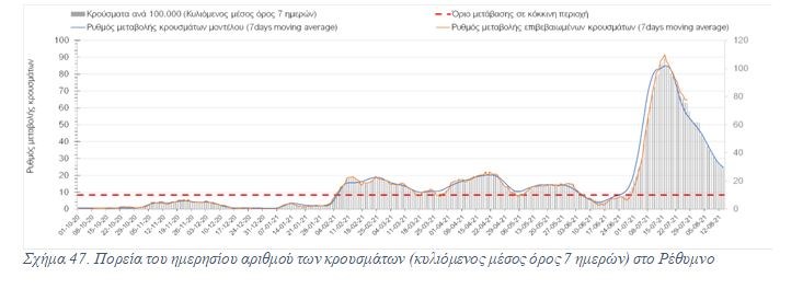Σχήμα 47. Πορεία του ημερησίου αριθμού των κρουσμάτων (κυλιόμενος μέσος όρος 7 ημερών) στο Ρέθυμνο