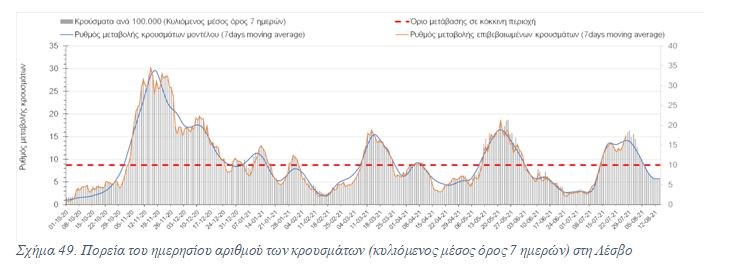 Σχήμα 49. Πορεία του ημερησίου αριθμού των κρουσμάτων (κυλιόμενος μέσος όρος 7 ημερών) στη Λέσβο