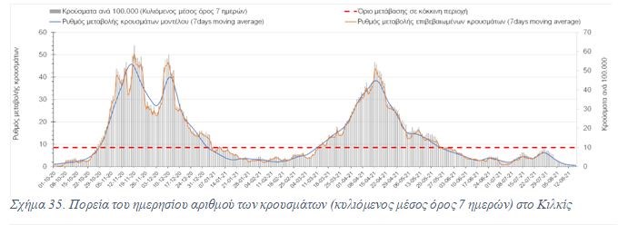 Σχήμα 35. Πορεία του ημερησίου αριθμού των κρουσμάτων (κυλιόμενος μέσος όρος 7 ημερών) στο Κιλκίς