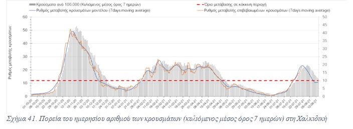 Σχήμα 41. Πορεία του ημερησίου αριθμού των κρουσμάτων (κυλιόμενος μέσος όρος 7 ημερών) στη ΧαλκιδικήΌσον αφορά στη Θράκη, στη Ροδόπη εντοπίστηκαν 5 κρούσματα (Σχήμα 42) ενώ στην Ξάνθη εντοπίστηκαν 11 κρούσματα (Σχήμα 33), οπότε και στις 2 αυτές πόλεις διαμορφώνονται πτωτικές τάσεις. Στον Έβρο εντοπίσθηκαν 37 κρούσματα (Σχήμα 44), η περιοχή πέρασε τα όρια χαρακτηρισμού ως κόκκινη περιοχή και ανησυχεί η αύξηση των τελευταίων ημερών που υποδηλώνει συρροή, οι οποίες στις μικρές πόλεις έχουν φανεί ικανές να ξεκινήσουν σημαντικές αλυσίδες μετάδοσης, οι οποίες διαμορφώνουν ανοδικά κύματα.