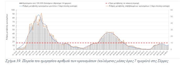 Σχήμα 39. Πορεία του ημερησίου αριθμού των κρουσμάτων (κυλιόμενος μέσος όρος 7 ημερών) στις Σέρρες