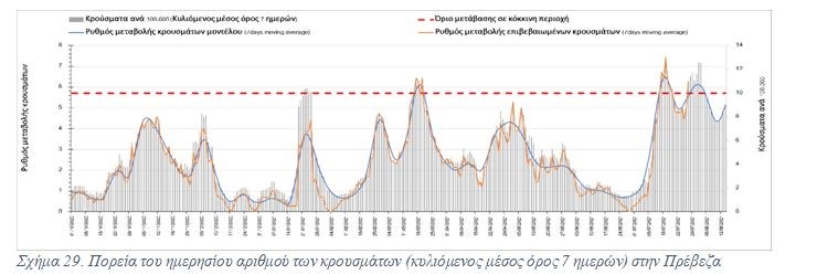 Σχήμα 29. Πορεία του ημερησίου αριθμού των κρουσμάτων (κυλιόμενος μέσος όρος 7 ημερών) στην ΠρέβεζαΌσον αφορά στις πόλεις της Βορείου Ελλάδας, αύξηση παρουσιάζεται στην Ημαθία με 22 κρούσματα (Σχήμα 30), στην Καβάλα με 20 κρούσματα (Σχήμα 45), στην Πέλλα με 26 κρούσματα (Σχήμα 31), στη Φλώρινα με 20 κρούσματα (Σχήμα 33), στο Κιλκίς με 14 κρούσματα (Σχήμα 35), στην Πιερία με 30 κρούσματα (Σχήμα 37), στη Χαλκιδική με 31 κρούσματα (Σχήμα 41), στην Κοζάνη με 71 κρούσματα (Σχήμα 32) και στις Σέρρες με 19 κρούσματα (Σχήμα 39). Αντίθετα μείωση παρουσιάζεται στα Γρεβενά με 2 κρούσματα (Σχήμα 38) και στην Καστοριά με 6 κρούσματα (Σχήμα 40).
