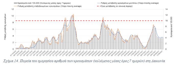 Σχήμα 14. Πορεία του ημερησίου αριθμού των κρουσμάτων (κυλιόμενος μέσος όρος 7 ημερών) στη Λακωνία