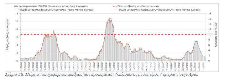 Σχήμα 28. Πορεία του ημερησίου αριθμού των κρουσμάτων (κυλιόμενος μέσος όρος 7 ημερών) στην Άρτα
