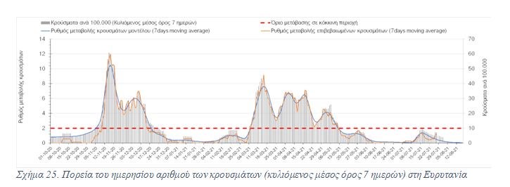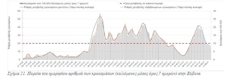 Σχήμα 21. Πορεία του ημερησίου αριθμού των κρουσμάτων (κυλιόμενος μέσος όρος 7 ημερών) στην Εύβοια