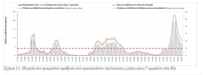 Σχήμα 51. Πορεία του ημερησίου αριθμού των κρουσμάτων (κυλιόμενος μέσος όρος 7 ημερών) στη Χίο