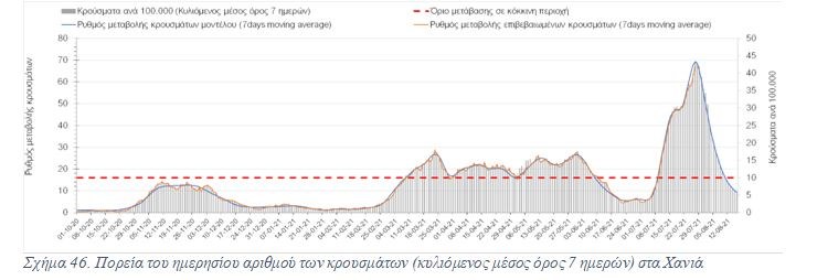 Σχήμα 46. Πορεία του ημερησίου αριθμού των κρουσμάτων (κυλιόμενος μέσος όρος 7 ημερών) στα Χανιά