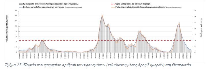 Σχήμα 27. Πορεία του ημερησίου αριθμού των κρουσμάτων (κυλιόμενος μέσος όρος 7 ημερών) στη Θεσπρωτία