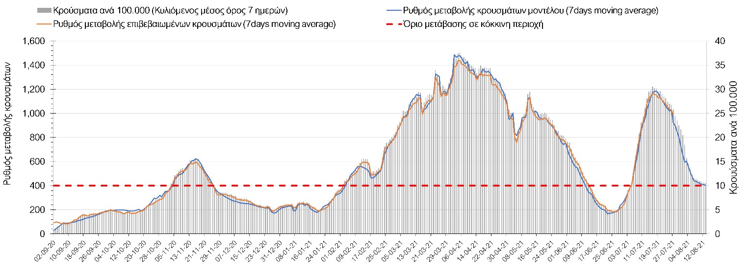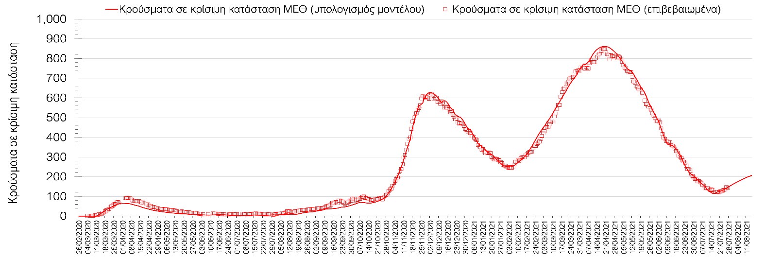 Σχήμα 4. Πορεία του ημερησίου αριθμού των κρουσμάτων (κυλιόμενος μέσος όρος 7 ημερών) στην Ελληνική επικράτειαΣτις επιμέρους περιοχές με υψηλό υγειονομικό κίνδυνο, παρατηρείται υψηλότερος αριθμός κρουσμάτων στη Θεσσαλονίκη με 398 κρούσματα (262 κρούσματα τη Δευτέρα), και στην Αττική με 1332 κρούσματα (671 κρούσματα τη Δευτέρα). Η Αττική πλέον αντιπροσωπεύει περίπου το 37% των κρουσμάτων, και εμφανίζει σχεδόν 3.5 φορές περισσότερα κρούσματα από τη Θεσσαλονίκη. Η πορεία των κρουσμάτων στην Αττική, παρουσιάζεται στο Σχήμα 5, ενώ η πορεία των κρουσμάτων σε κρίσιμη κατάσταση (διασωληνωμένοι σε ΜΕΘ) παρουσιάζονται στο Σχήμα 6. Από την αρχή του μήνα παρατηρείται μια αύξηση του αριθμού των κρουσμάτων στην Αθήνα, η οποία δεν συνάδει ούτε με τη διαμόρφωση της μεταδοτικότητας από τη θερμοκρασία, αλλά ούτε και με τα υπάρχοντα μέτρα, και η οποία τη έχει φέρει πέρα από το όριο της κόκκινης περιοχής. Μια πιθανή εξήγηση είναι η αυξημένη διασπορά στην κοινότητα των μεταλλαγμένων στελεχών Β.1.1.318 και Β.1.167, οπότε και αναμένουμε τα δεδομένα των επομένων ημερών για να μπορέσουμε να διαμορφώσουμε μια πιο σαφή εικόνα. Με βάση τη μεγάλη απόκλιση που εμφανίζει η Αττική, η πορεία της μπορεί να εξηγηθεί μόνο εάν ληφθεί υπόψη πολύ μεγαλύτερη εγγενής μεταδοτικότητα του ιού, συνεπώς η διασπορά των ταχύτερα μεταδιδόμενων μεταλλάξεων είναι πολύ μεγαλύτερη από ότι στη Θεσσαλονίκη, καθώς επίσης και ότι παρατηρήθηκαν φαινόμενα έντονων συρροών. Tα πραγματικά δεδομένα εξηγούνται μόνο εάν θεωρήσουμε ότι το στέλεχος Β.1.1.318 έχει κυριαρχήσει έναντι του Β.1.1.7, και ταυτόχρονα η διασπορά του Β.1.167 είναι μεγαλύτερη από ότι είχε προσδιοριστεί στα μέσα Ιουνίου, με τα τωρινά αποτελέσματα επιβεβαιώνουν την τότε εικασία μας. Αξίζει να σημειωθεί, ότι με τα δεδομένα των τελευταίων ημερών, παρατηρείται πτωτική τάση, και η επίδραση των φαινομένων συρροής φαίνεται να περιορίζεται, οπότε και με τα σημερινά αποτελέσματα επιβεβαιώθηκε η πρόβλεψη μας από τις 16/7, ότι θα μεταβούμε σε κάποιας μορφή αποκλιμάκωση, εκτός εάν επαναληφθούν φαινόμενα έντονης συρροής. Για την ώρα, διαφαίνεται ότι η Αττική έχει περιέλθει σε πτωτική πορεία, η οποία πιστεύουμε ότι θα συνεχιστεί, με δεδομένη και την μειωμένη κινητικότητα που θα παρατηρηθεί από τη ερχόμενη εβδομάδα λόγω της μετάβασης μεγάλου μέρους του πληθυσμού σε τουριστικούς προορισμούς.