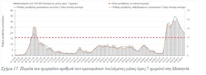 Σχήμα 17. Πορεία του ημερησίου αριθμού των κρουσμάτων (κυλιόμενος μέσος όρος 7 ημερών) στη Μεσσηνία