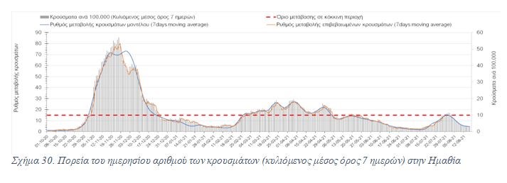 Σχήμα 30. Πορεία του ημερησίου αριθμού των κρουσμάτων (κυλιόμενος μέσος όρος 7 ημερών) στην Ημαθία