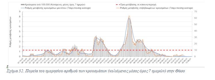 Σχήμα 52. Πορεία του ημερησίου αριθμού των κρουσμάτων (κυλιόμενος μέσος όρος 7 ημερών) στην Θάσο