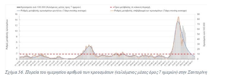 Σχήμα 56. Πορεία του ημερησίου αριθμού των κρουσμάτων (κυλιόμενος μέσος όρος 7 ημερών) στην Σαντορίνη