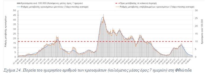 Σχήμα 24. Πορεία του ημερησίου αριθμού των κρουσμάτων (κυλιόμενος μέσος όρος 7 ημερών) στη Φθιώτιδα